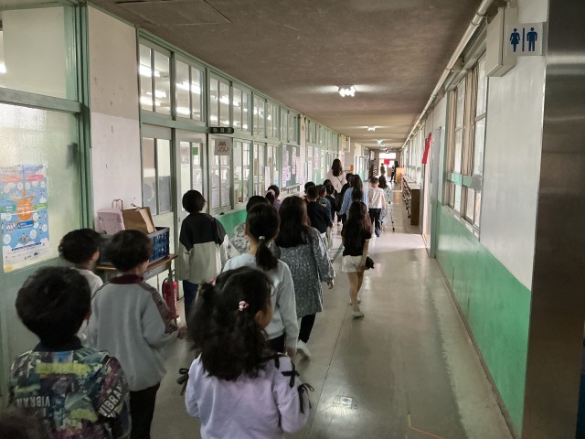 2年生は1年生に学校を案内するために学校の教室や職員室などをまわって予習しました。