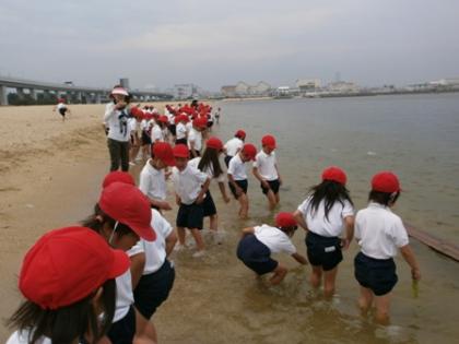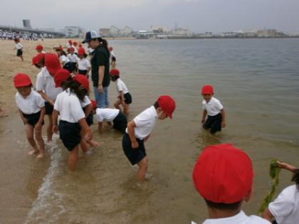 二色の浜に到着後、白石先生から海に入る時に気をつけることを教えてもらいました。「海は急に深くなっているから、膝から下までしか入ってはいけません。」という話を聞いたときに、「そうなんや、海って怖いんや。」「知らんかった。」と子どもたちは言っていました。