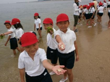 海に入ると、「うわ〜、冷たい〜。」「砂が靴の中に入って痛い〜。」「冷たくて気持ちいいやん。」など、口々に感想を言いながら海水や砂の感触を楽しんでいました。一人の子どもが貝殻を拾い始めると、すぐに周りの子どもたちに広がり、貝殻や海藻を一生懸命拾っていました。