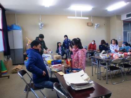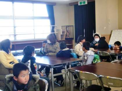 まわって動く牛乳パック工作の講座の様子です。会議室で開催しました。校区にお住まいの籔内さんが作り方をわかりやすく教えてくれて、子どもたちは工作にとりくみました。完成した子どもたちは早速遊んで楽しんでいました。