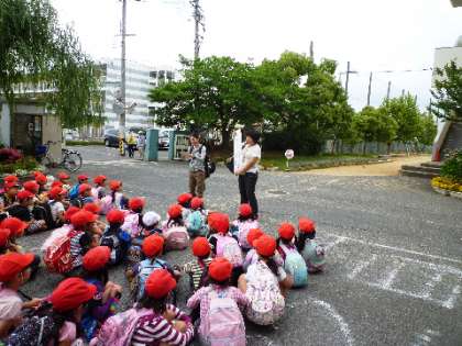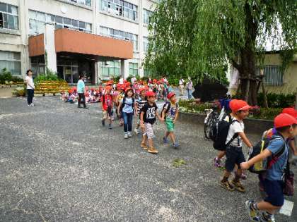 子どもたちは玄関前に集合し、まず橋本先生のお話を聞きました。その中で、「かってなことをしない」「人にめいわくをかけない」という大切なルールを確認しました。そして、付き添いに行ってくださる先生方に、元気な声であいさつをしました。