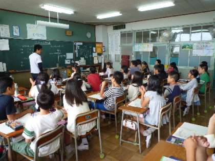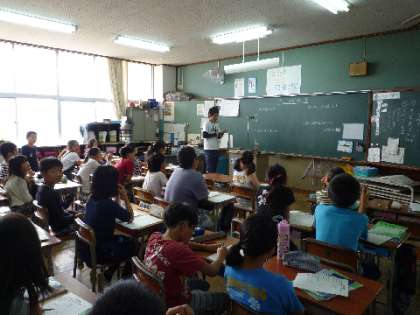 ガリレオの実験で有名な振り子の実験ですが、5年生でもおもりの重さや振れ幅、ひもの長さを変えて実験を行います。子どもたちは大きな声で振り子が往復する回数を数え、その規則性に気づいていきました。