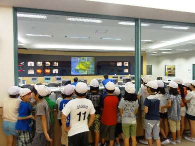 焼却炉全体を管理する、中央制御室ものぞかせていただきました。たくさんのモニターや機械が並んでいて、子どもたちもびっくりです。ごみを燃やしている様子もモニターを通して見ることができました。
