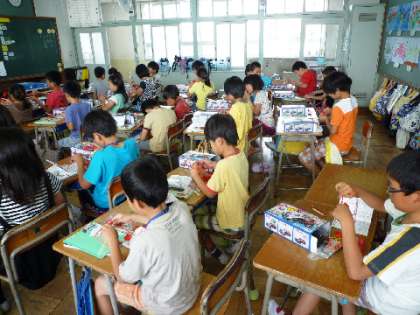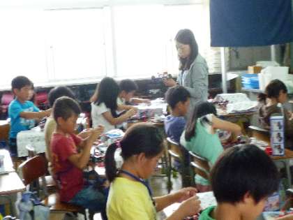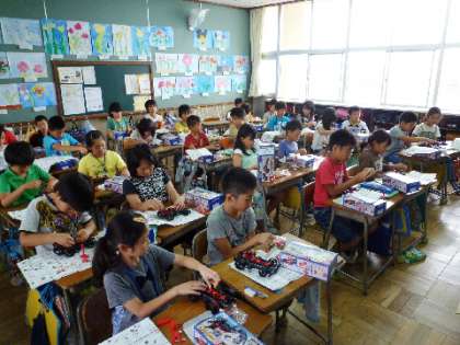電気の学習をする中で、モーターカーを作成しています。電気の回路は少しでも切れていると電気が流れないので、モーターカーは動きません。ミスの無いように、子どもたちは真剣に作っていました。
