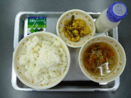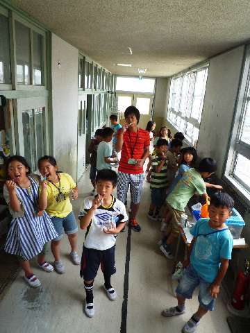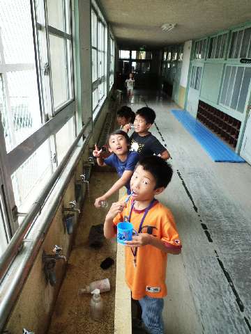 写真は、給食を食べた後に歯みがきをしている子たちの様子です。中村先生も一緒にしっかりと磨いています。
