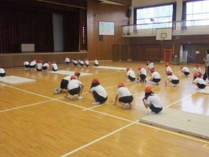 体育館でマット運動の学習中です。