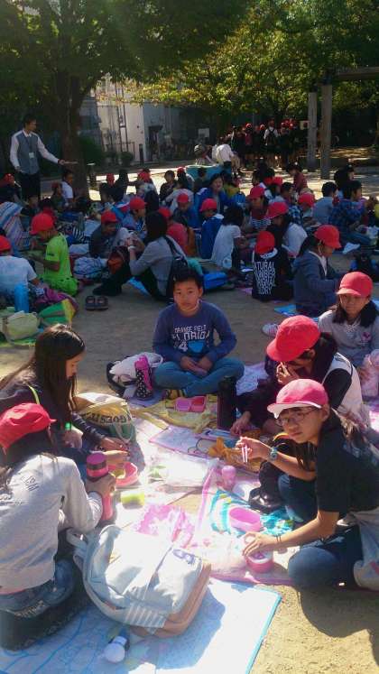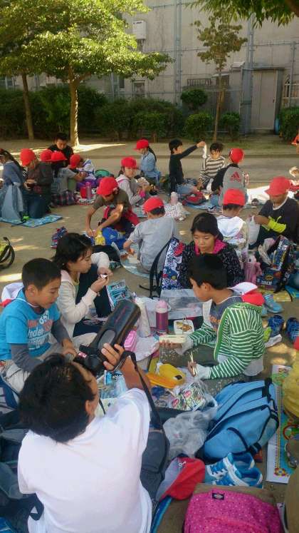 昼食の様子です。お弁当とコリアタウンで買ったおかずを子どもたちは美味しそうに食べています。