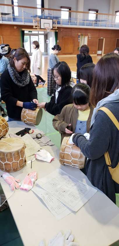 本物の牛の皮を使って、太鼓をつくりました。協力頂いた保護者の皆様、ありがとうございました。