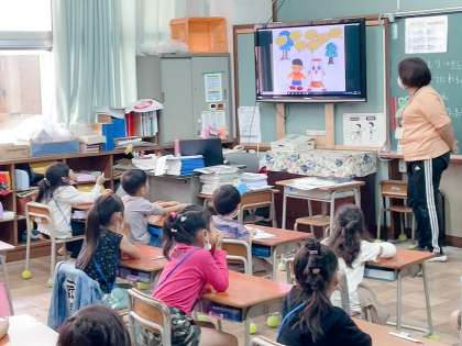 各学年で喫煙防止教育に取り組んでいます。写真は1年生の様子です。アニメーションを見ながら、喫煙防止について学習をしています。