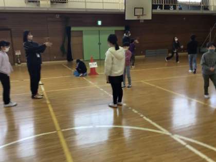 体育館での昔あそびの体験では、竹とんぼ、おてだま、こままわし、めんこなど、いろいろなあそびを丁寧に教えていただきました。