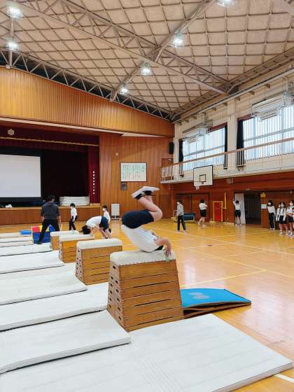 5年3組の体育では、台上前転を学習しています。自分の到達度に合わせた台で、何度も練習しました。