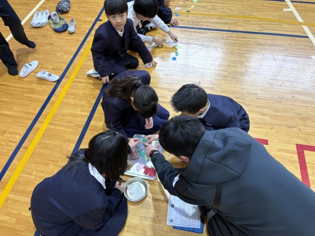 4年生と5年生が、英語を使ってさまざまな形のカードをやりとりしながら学習を行いました。