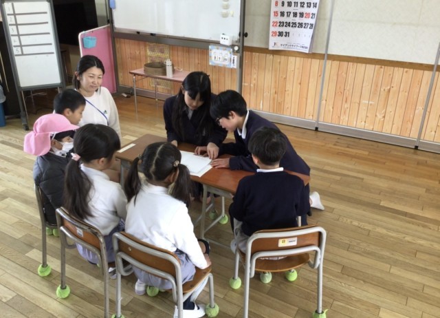 昼休みの時間を使って、子どもたちが自分たちで作った絵本を持ち、幼稚園へ読み聞かせに行きました。 手作りのとび出す絵本(しかけ絵本)は大人気で、幼稚園の子どもたちは目を輝かせながら楽しんでいました。