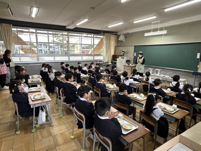 1年生にとっては初めての給食です。担任の先生からエプロンの着かたや配膳のしかたを教わり、いざ給食!!
