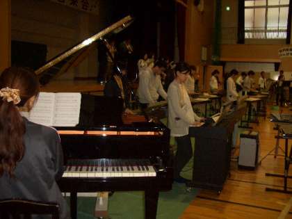 校内音楽会のはじめにみんなで歌う「音楽のおくりもの」の伴奏は、先生方の楽器演奏です。