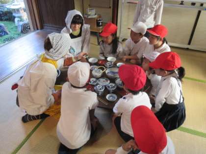 この日、先生を務めていただいたのは、福祉委員会の方をはじめとする地域のみなさんでした。昔ながらの着物を着て来てくれた方もおられ、3年生はしばしの間、昔の生活を身近に感じることができました。