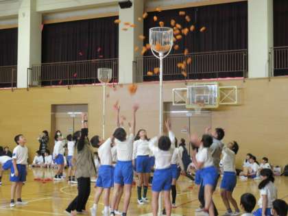 6年生は保護者の方にも参加していただき、学年みんなで楽しく「アジャタ大会」を行いました。(写真上)