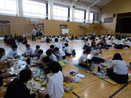 体育館にて学年全体で行っていることもあり、いつもとかなり違う雰囲気での食事を満喫できたようですね。他の学年の人は6年生になるのを楽しみにしていてください。