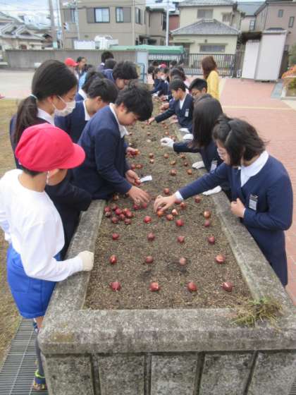 春にいっぱい咲きますようにと、ガーデニング委員会の子どもたちが正門近くの花壇に球根を植えてくれました。
