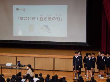 1月21日(月)朝礼の時間に給食集会がありました。給食委員会から、豆と魚の栄養についての話の後、給食時の○×クイズがありました。豆や魚が苦手と思う子どもたちも多いですが、どちらも成長のためにとっても大切な食材であることが分かったのではないかと思います。また、給食時のルールについても再確認する良い機会になったと思います。給食委員会の皆さん、お疲れ様でした!