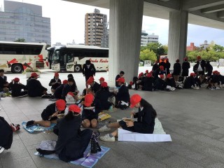 広島焼きのお弁当を食べています。みんな美味しそうに食べています。