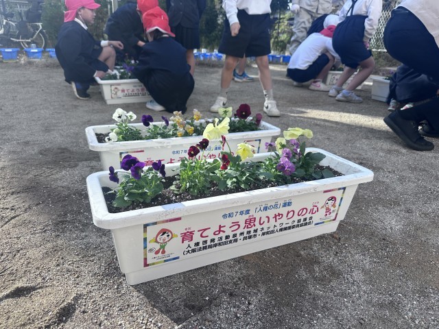 今日、2年生は「人権の花運動」として、人権擁護委員さんとともにプランターにお花を植えました。