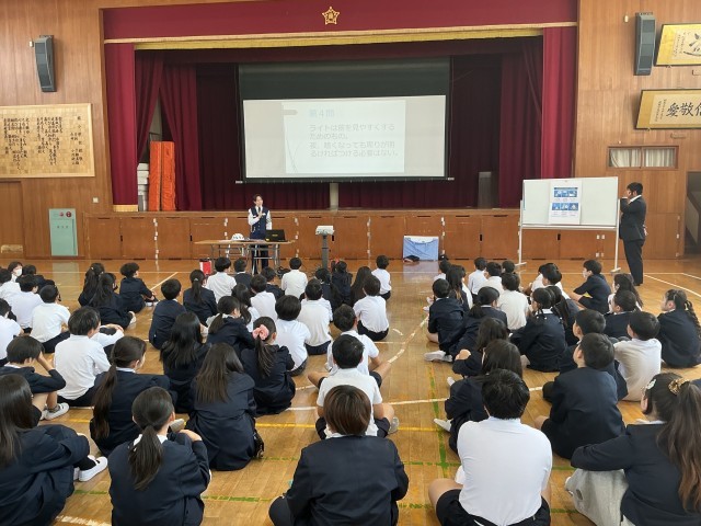 今日は警察の方にお越しいただき、1・3・5年生の交通安全教室が行われました。
