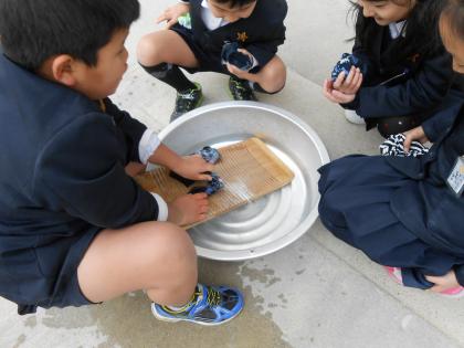 金だらいに水を張って、洗濯板の上で靴下を洗う体験をしました。洗濯機のない時代はこのようにして毎日洗濯していたのです。それにしても冬場の洗濯は辛かったでしょう。でも児童の皆さんは寒さにも負けず、冷たい水に手をつけてごしごし洗っていましたよ。