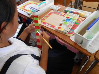 5年生のあるクラスは「創作スマートボール」の製作に励んでいました。細かく絵の具で描いています。仕上がったら、糸鋸で切り取った枠木を貼り付け、次に鉄球発射台と釘を打ち込んで完成させるのでしょうね。皆さん楽しそうに作業していました。