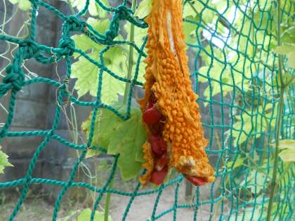 ゴーヤの実は 緑色のうちに収穫し スライスした後 野菜炒めなどにしていただいたりします。味は少々苦いですが ビタミンCたっぷりだそうで 夏ばて防止にシークワーサーとまぜてジュースにしていただいたりもします。ゴーヤの種って真っ赤で しかもこんなに大きいのですね。びっくりしました。食物の成長を観察しているといろいろな発見があっておもしろいです。