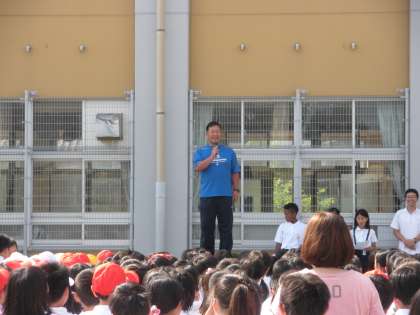 今日の児童集会では、明日の「不審者対応避難訓練」の予告と、不審者役の先生の紹介が行われました。2001年6月8日に起こった付属池田小事件を風化させず、子どもたちの命を守るために、不審者の侵入を仮定した、避難訓練を行います。明日は、2人の先生が「不審者役」を行いますが、子どもたちが必要以上に不安にならないように、しかし、真剣に訓練を行うように、担当の小川先生からお話をしました。