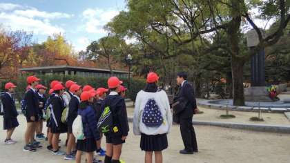 本川小学校への道途中にある碑を、中橋さんが案内してくれています。