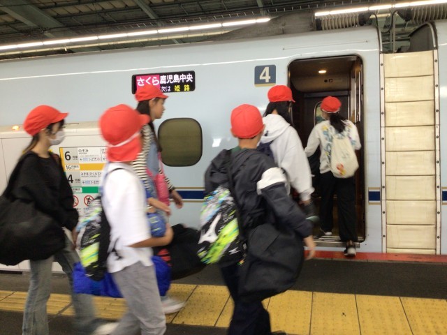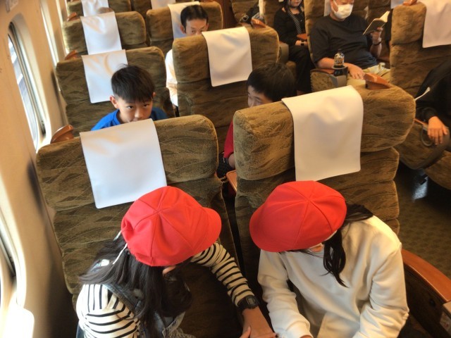 新幹線に乗車中です。姫路城が見えています。あっという間に広島に到着しそうです。トランプやお話をしながら楽しく過ごしています。初めて新幹線に乗る子もいるようでワクワクしてくれています!