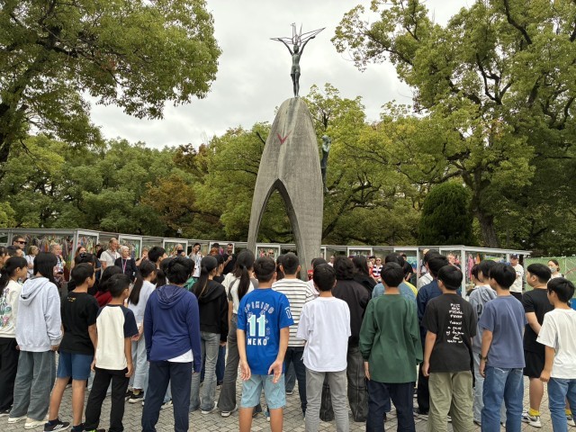 碑めぐりを終え、原爆の子の像の前で慰霊祭を行いました。北小学校全児童の思いを載せた千羽鶴をささげてきました。平和宣言をし、自分たちの身近な平和を誓っていました。言葉にするだけでなく、ぜひ、行動にうつしてほしいと思います。これまで練習してきた「ヒロシマの有る国で」を歌い、周りで見ていた海外の方たち、ヒロシマに思いをもって来られた多くの方たちからたくさんの拍手もいただきました。今は、聞きとり学習をしています。被爆体験者の方からの聞きとりは減ってしまい、今回は被爆された家族の方からお話を聞かせてもらっています。平和ってなんだろうか、今ある平和について考え続けてほしいと思います。