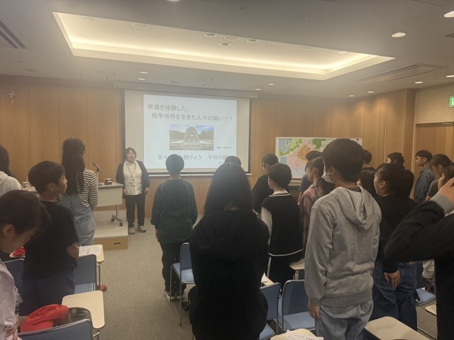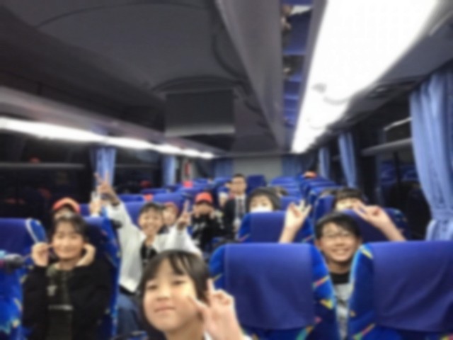 平和学習を終え、バスでホテルに向かっています。バスの中ではまだまだ元気な子どもたち。眠たそうな子も中にはいますが…バスに乗ってから雨が降り始めました。平和学習中はなんとか雨に降られずでした!ホテルまでアニメを見ながら過ごしています。