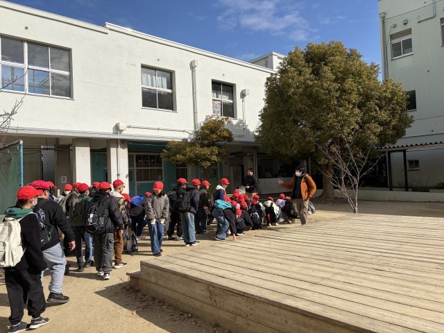 今日は5年生の校外学習でコリアタウンに来ています。貝塚駅から鶴橋駅まで電車に揺られ、とことこ歩いてコリアタウンへ。御幸森神社を通って『いくのパーク』にやってきました。今から、講師の先生からお話を聞かせてもらいます。
