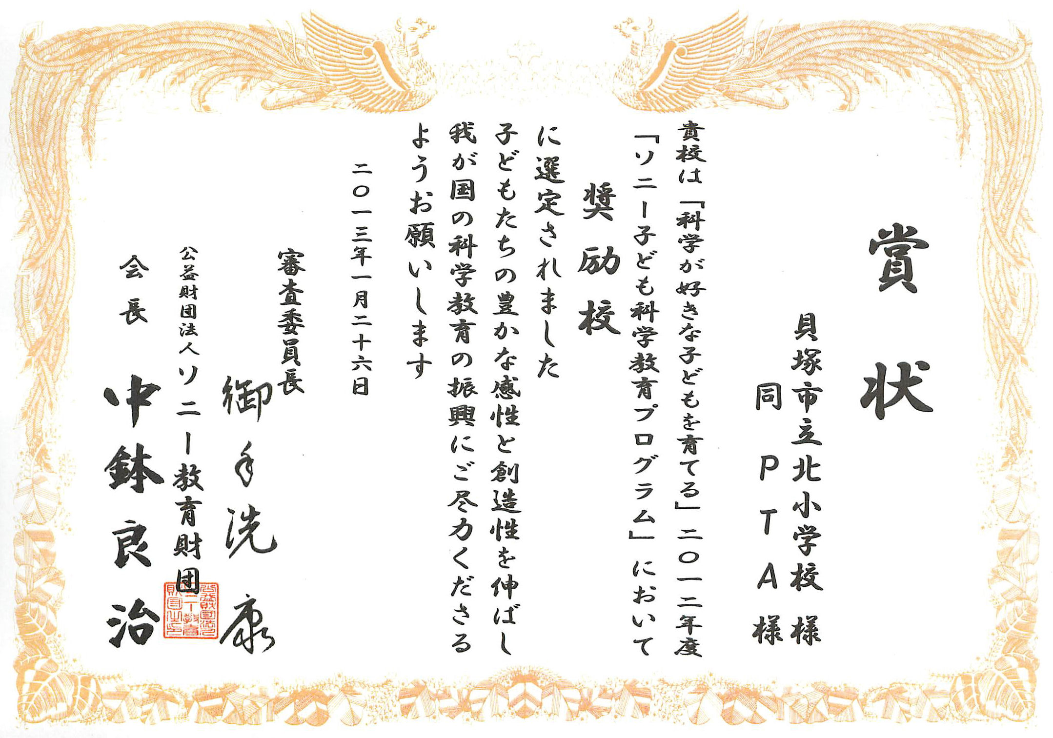 その一環として、「科学が子どもを育てる」2012年度「ソニー子ども科学教育プログラム」に普段の理科学習の様子や校内の学習環境整備などを論文の形で応募したところ、「奨励賞」をいただくことができました。