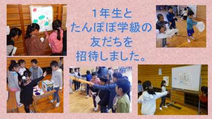 12月6日(水)の1・2時間目、2年生は、生活科の学習「おもちゃランド」がありました。1年生とたんぽぽ学級のお友だちを体育館に招待し、自分たちで考えた遊びを紹介しました。手作りの道具や看板など、工夫を凝らした遊びが並びました。