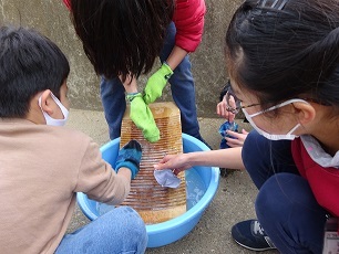2月9日(火)3年生で洗濯体験をしました。洗濯板とたらいを使って体験をしました。昔の生活の大変さを感じることができました。子どもたちにとって初めての体験でもあり、楽しく学習することができました。