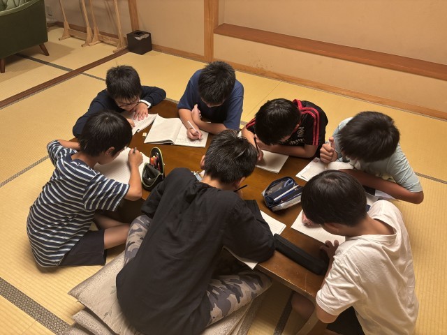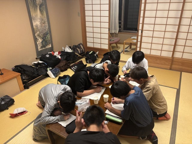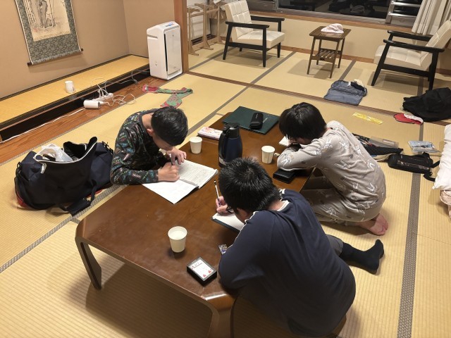修学旅行1日目 お風呂も終え、1日目のふりかえりをしています。内容の濃い1日でした。男子編