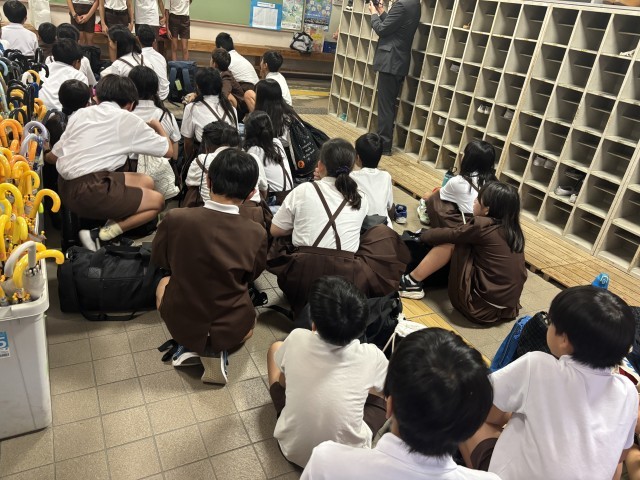 2025修学旅行 無事に帰校して終わりのあいさつを済ませました。家族のみなさんお迎えありがとうございました。