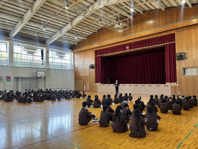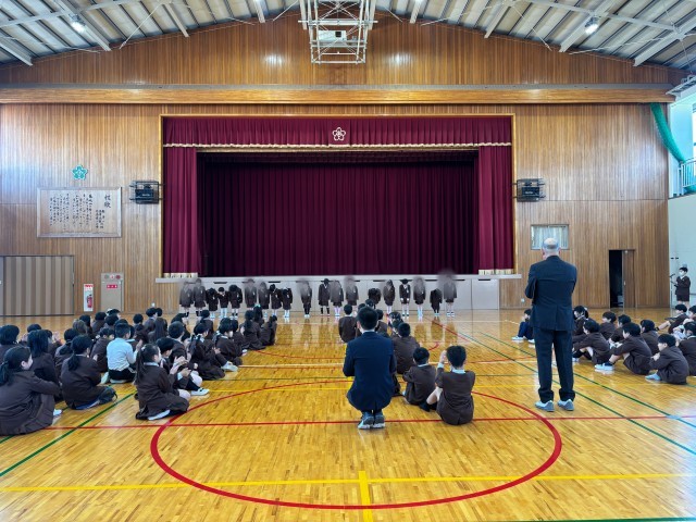 その後、昨日入学したばかりの1年生19名との「対面式」が行われました。 2〜6年生が優しい拍手で迎える中、少し緊張した面持ちで整列した1年生。全員で「よろしくお願いします!」と元気に挨拶をすることができました。一生懸命に声を揃える初々しい姿に、上級生からも自然と温かな笑顔がこぼれていました。