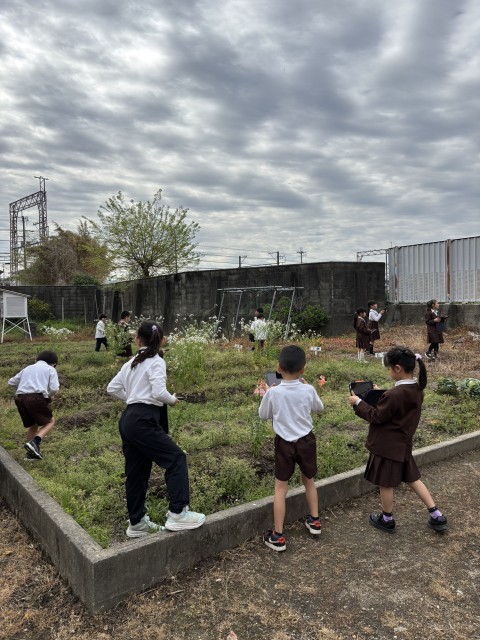 「あ!ここにきれいなお花がある!」「こっちにも見つけたよ!」と、元気いっぱいの子どもたち。見つけた春をiPadで丁寧に撮影していました。