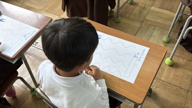 名前を書いた後は、線を引く練習もしました。 自分の思い通りに鉛筆を動かそうと、紙をしっかり押さえて、筆圧にも気をつけて書いている姿がとても印象的でした。