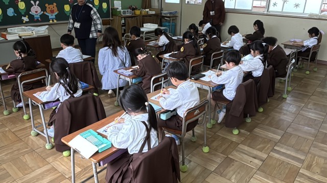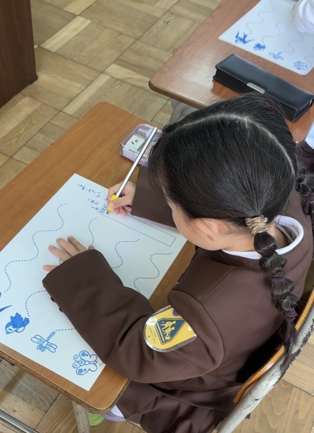 まずは、鉛筆の正しい持ち方から教わりました。 少し緊張した面持ちで鉛筆を握り、ワークシートに向かう1年生。 自分の名前を、一文字一文字、心を込めて書いていきました。 みんな集中して取り組んでいました。