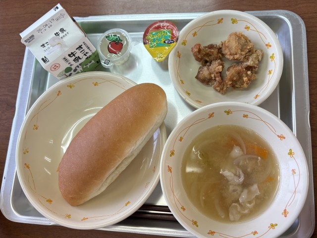 今日の献立は、子どもたちに大人気の「唐揚げ」と、お待ちかねの「パン」。