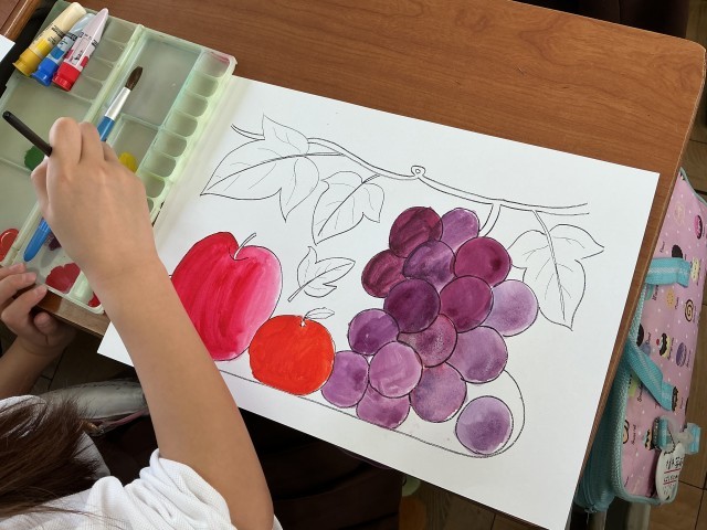 5年生図工「色の三原色」 赤・青・黄の絵の具を使って、きれいにフルーツを描きました!!