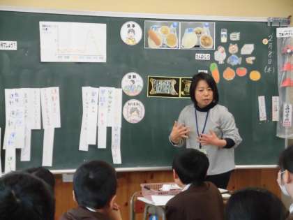 東小学校から栄養教諭の先生が来てくれて、食育の授業をしてくれました。まず、子どもたち一人ひとりで、健康になるにはどんなことが必要かを考えました。そして、班代表の子が、みんなに考えを発表しました。それぞれの意見が、しだいに食事、運動、休養・睡眠にまとめられる様子から、健康にはこの3つが大切なことを学びました。考えながら健康についてわかりやすく学べる授業を受けることができました。ありがとうございました。