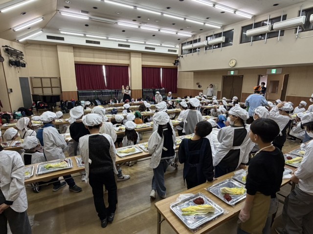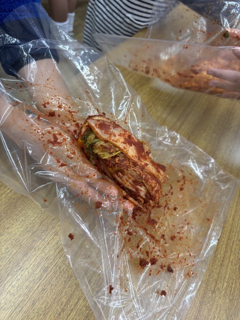 一晩塩漬けした白菜にヤンニョンをしっかり塗りこんで、キムチ作りをしています。