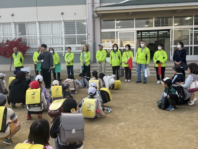民生児童委員さんの皆さんが毎月、1年生の下校の様子を見守っていただいています。今回は、新しい民生児童員さんが来られたので、1年生みんなに紹介がありました。これからもお世話になります。よろしくお願いします。